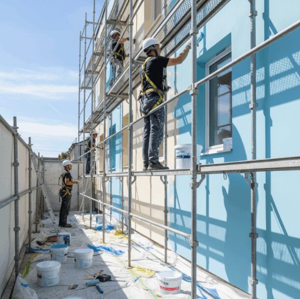 外壁塗装は「下塗り・中塗り・上塗り」の3回塗りが基本です。この工程を守るための適正な職人数が必要です。
